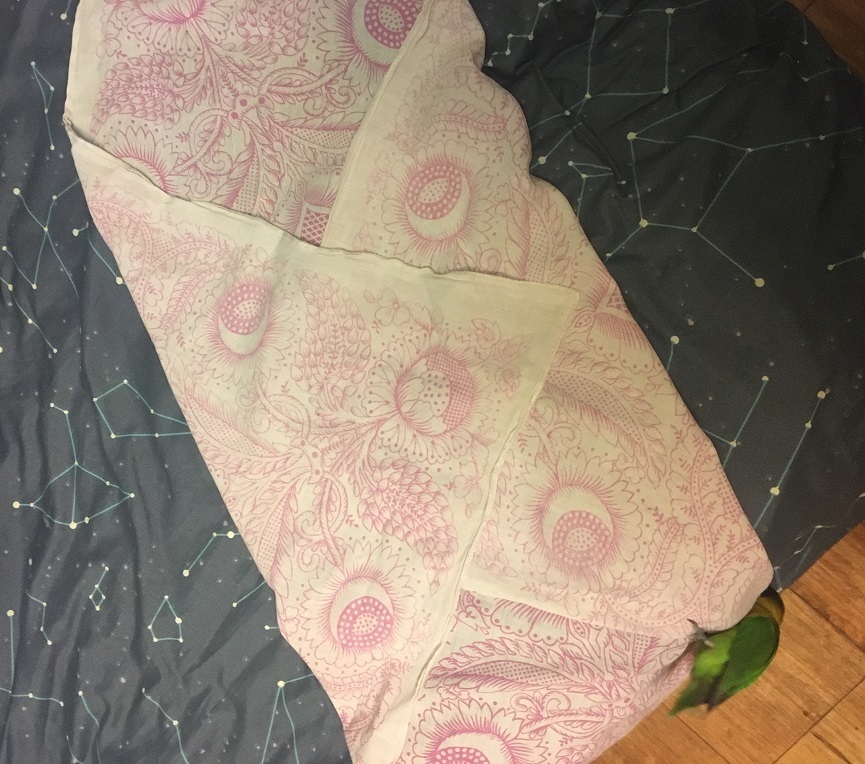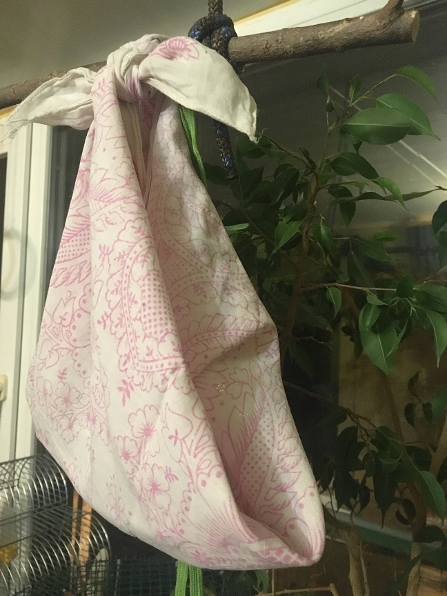 Ни на одном форуме не пишут, что нужно подвешивать попугаям кулёк для сна и отдыха, а тем временем Тормашка лежит там и балдеет. Лапки отдыхают, тельце завернуто в тепле, и что важно - удовлетворенное чувство безопасности, уединения и природной привычки к дуплованию. Ну и незаметно пыриться можно, что там вокруг происходит.