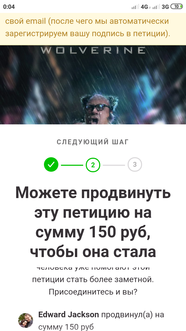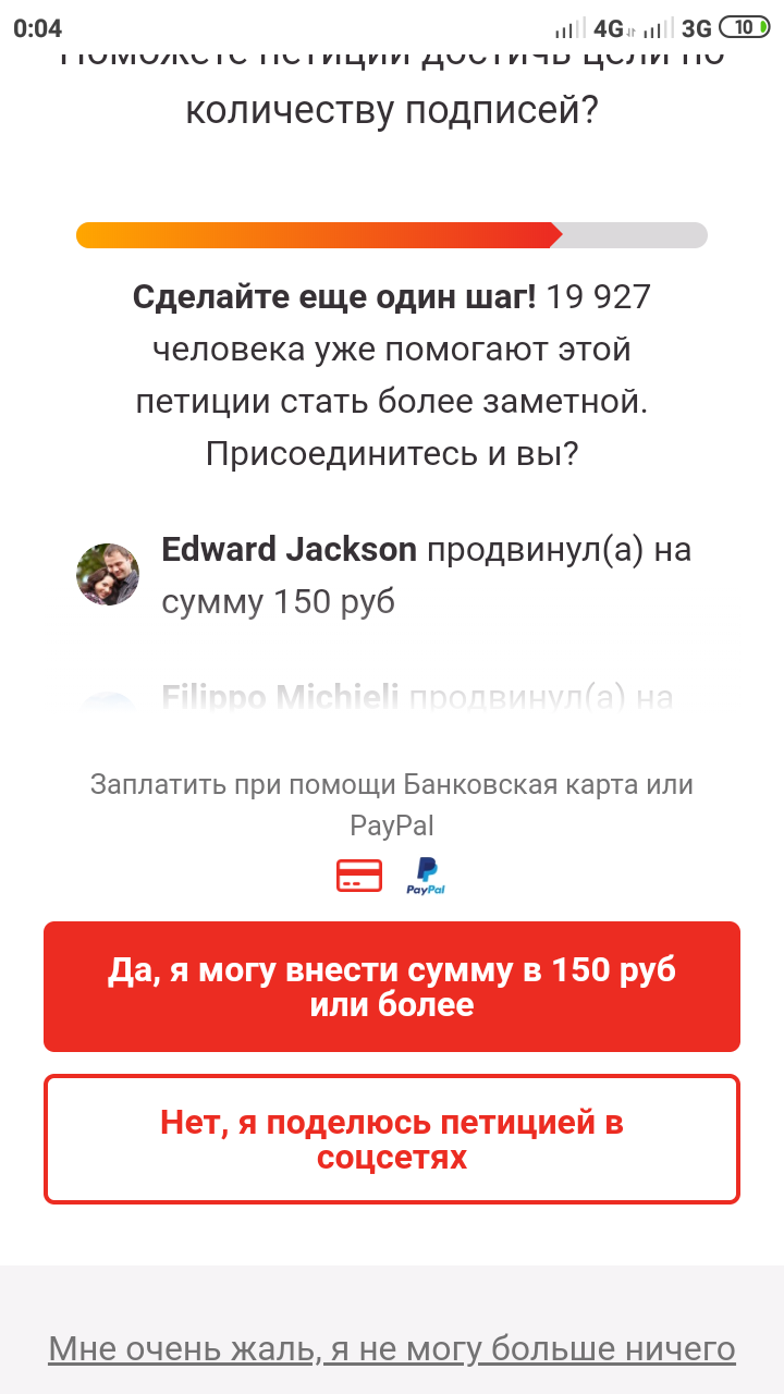 ТС, ответь почему перейдя по ссылке на петицию меня перебрасывает на сайт с просьбой ввести фио и почту, введя требуемое меня перебрасывает на следующую страницу с просьбой поддержать проект минимум на 150рубликов, в общем лень все описывать в деталях, похоже на очередной лохотрон, письмо на мыло так и не пришло..