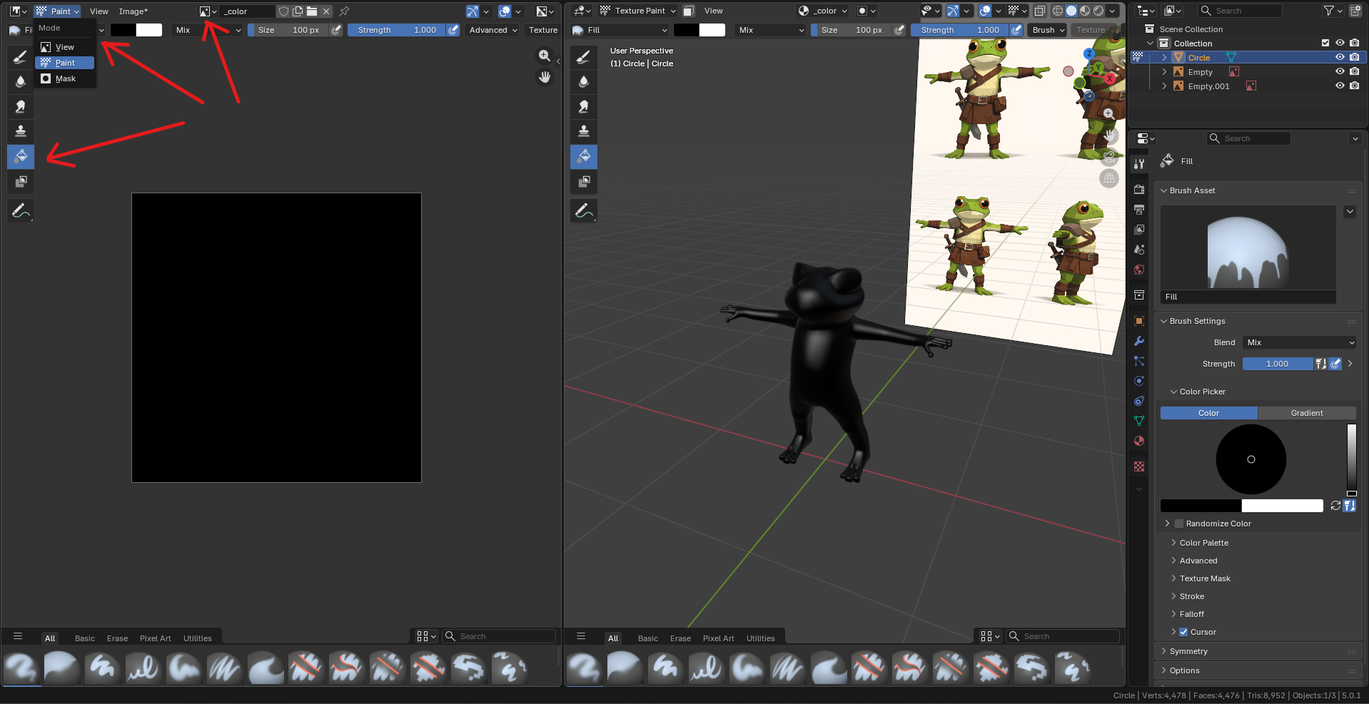 Переходим во вкладку Texture Paint. Сверху выбираем созданную ранее текстуру, меняем режим на Paint.
