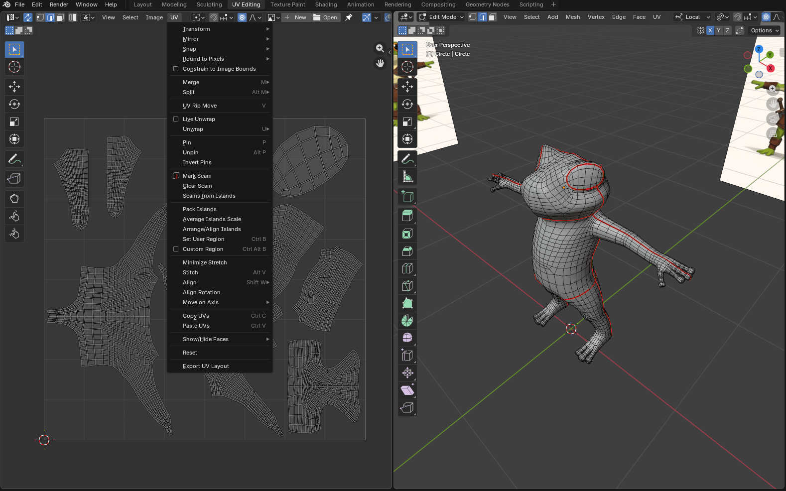 Я выбрал центральную линию проходящую церез бок персонажа, область вокруг глаз, шею, ноги и промежность. С выбранным гранями нажимаем правой кнопкой мыши и выбираем Mark Seam.