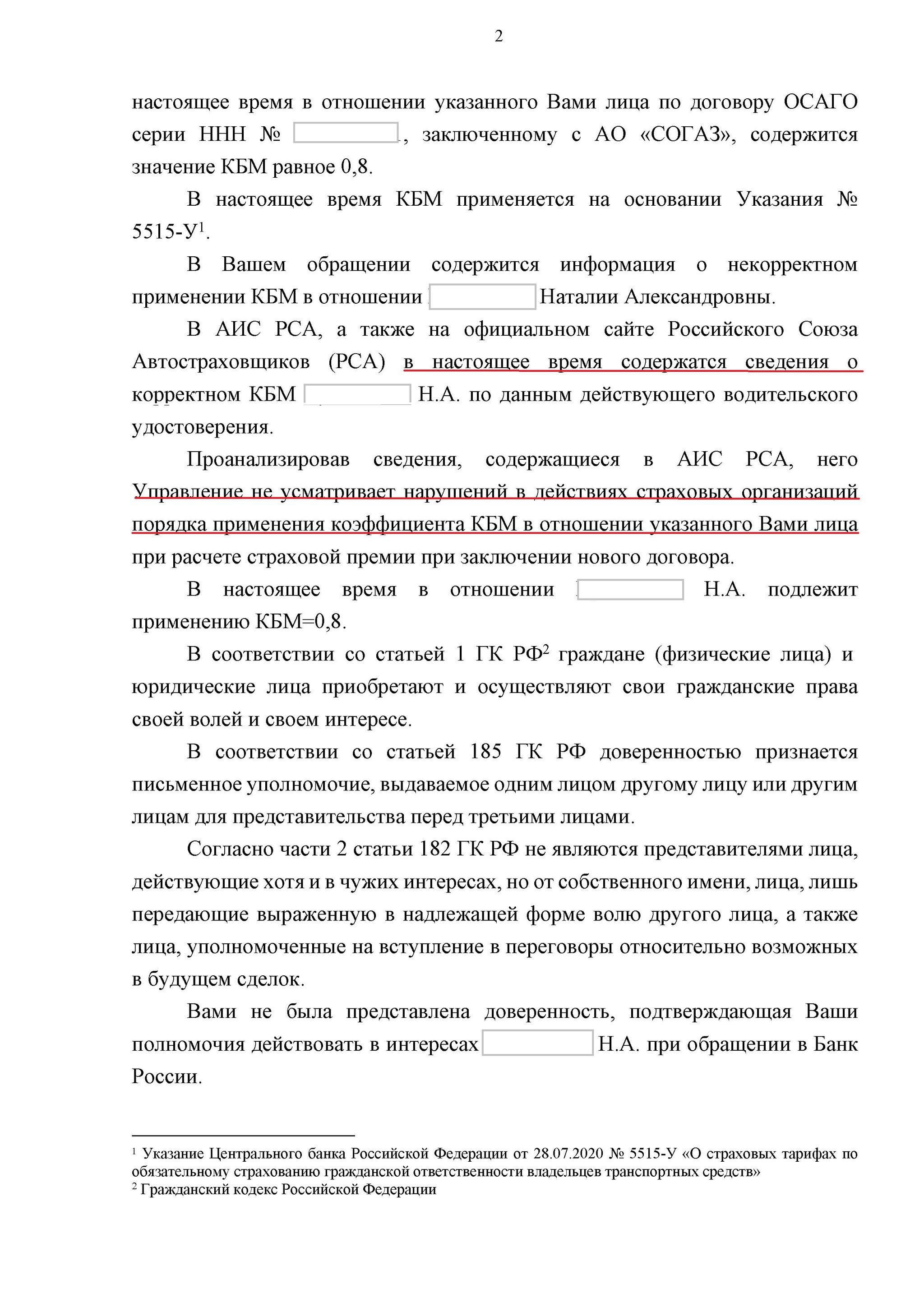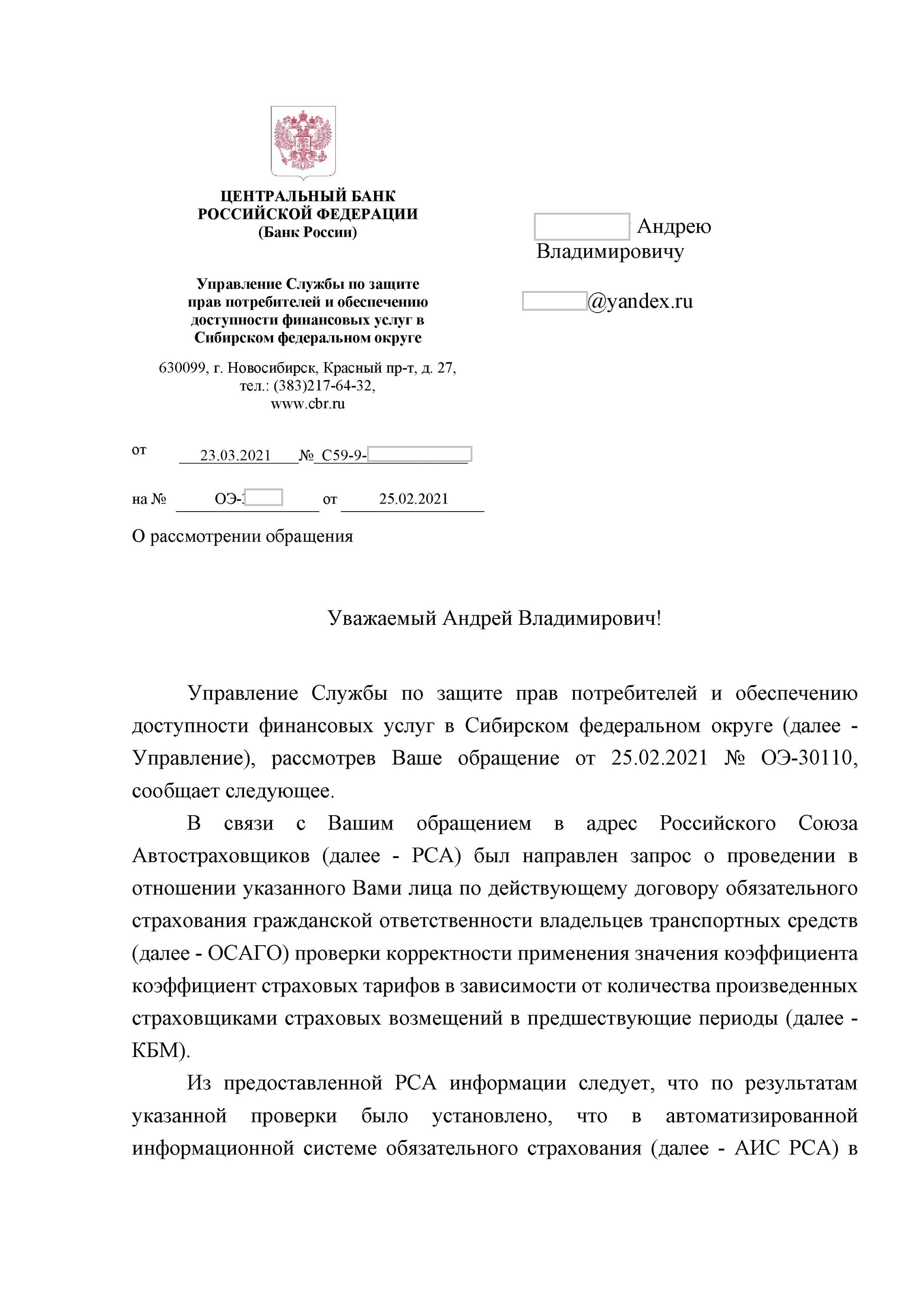 Честно, настроился уже заключать с женой договор на юруслуги, обращаться в суд и наказывать всех виновных рублем. А чтобы не было лишних вопросов в суде, решил написать еще заявление в РСА и ЦБ о корректировке КБМ. И вот спустя месяц получаю ответ:
