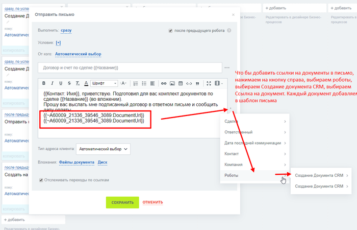 Нажимаем добавить робота - для сотрудника - генерация документа CRM.