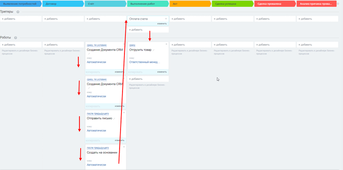 Далее добавляем еще одного робота который будет генерировать Счет. В первом случае мы делали непосредственно документ Счет, этот робот будет генерировать Счет как сущность CRM со своими статусами. После того как придет оплата счет автоматически перейдет в статус оплачен, сделка перейдет на следующую стадию а сотруднику поставится задача на отгрузку товара. После того как все настроено у вас должна быть примерно такая картинка в разделе роботы.