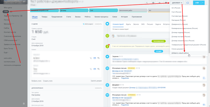 Далее лезем в CRM, открываем любую сделку, контакт или компанию и находим кнопку документы. Нажимаем на нее и выбираем добавить новый шаблон.