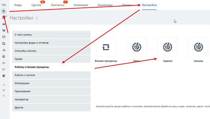 Заходим в раздел CRM-Настройки-Роботы и бизнес-процессы - Сделки.