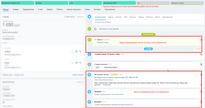 Все работает. Документы генерируются и отправляются клиенту. Триггер ждет оплату счета и переводит сделку на следующую стадию и пинает менеджера. На всю настройку первый раз потратил примерно 5 часов. Информацией пользовался с сайта поддержки CRM.
