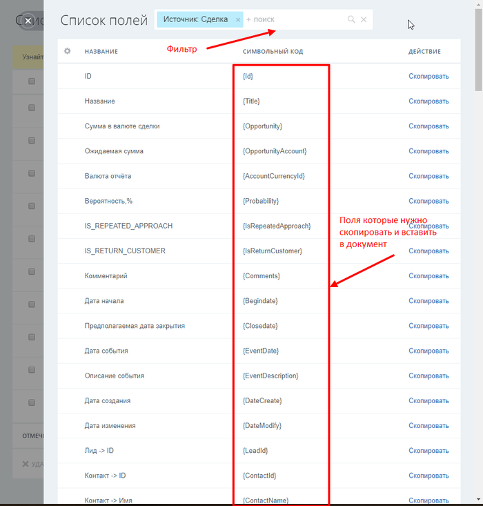 Далее выбираем все нужные поля которые должны будут заполняться в документе. Не забываем пользоваться фильтром. С помощью него можно выбрать в какой сущности искать поле.