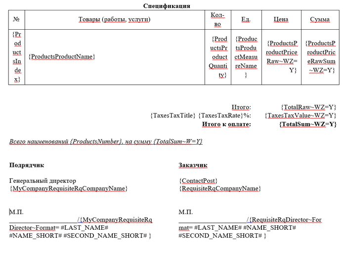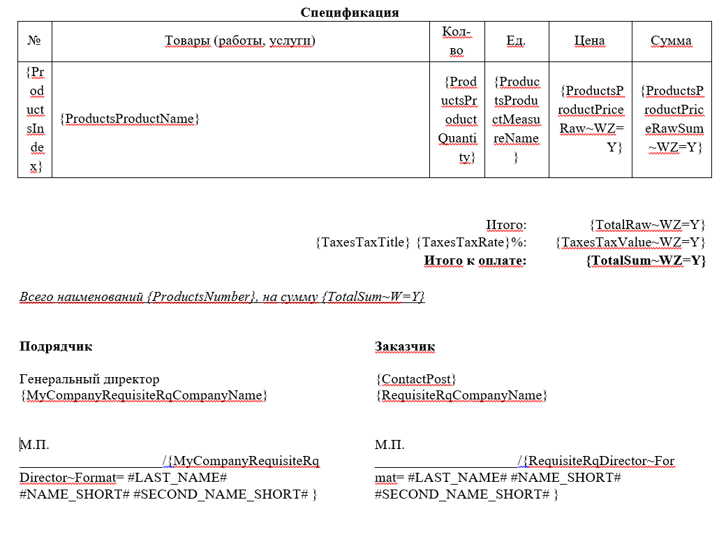 Далее внизу есть место под печать и подпись клиента. Его имя там должно быть написано Фамилия полностью, и инициалы. Здесь мы тоже пользуемся модификатором - {RequisiteRqDirector~Format= #LAST_NAME# #NAME_SHORT# #SECOND_NAME_SHORT# }