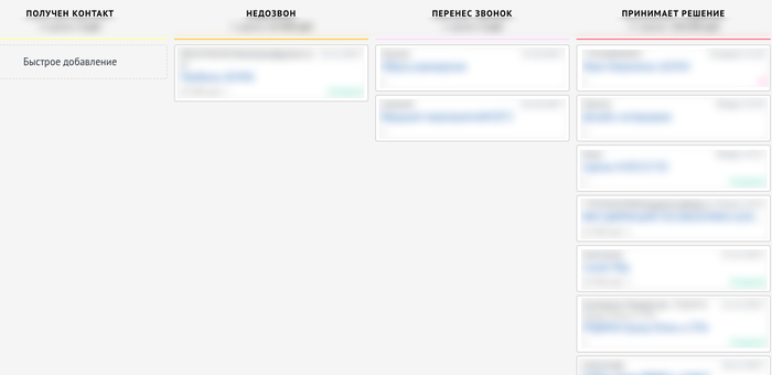 Это свежий скриншот, а когда мы посмотрели в воронку в первый раз, большинство заявок скопилось на стадии «недозвон». Это было узкое место внутри узкого места! Проблемы на участке продаж оказались связаны с тем, что менеджер в половине случаев не дозванивался, а потом у него уже не было времени позвонить.