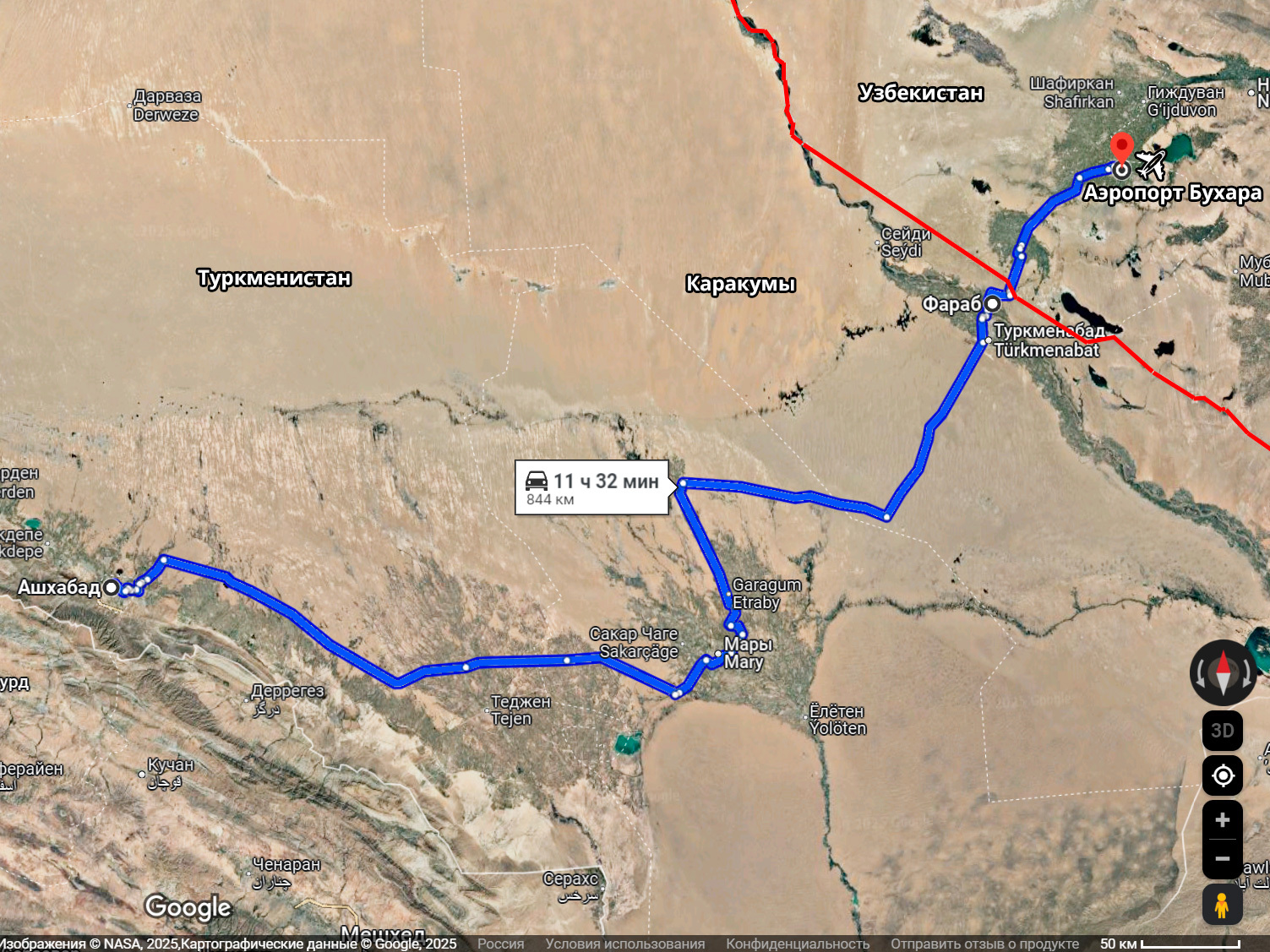 Мой маршрут от Ашхабада до аэропорта Бухары. Время Google считает, конечно, без учета границы пешком и всех пересадок.