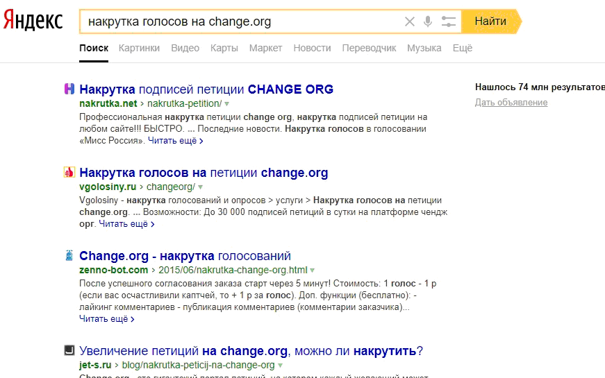 Но что это!? Никто не хочет подписывать вашу петицию! Несколько сотен заправских активистов, не глядя подмахивающих все подряд, от требования озеленения Луны до протеста против геноцида холерных вибрионов отметились, и на этом – все… Дело исправимо! Ченч.орг славится тем, что не отслеживает накрутки. Значит вопрос всего лишь в деньгах. Ищем предложения в интернете. А их там – тьмы и тьмы!