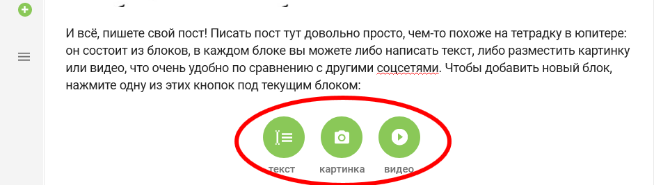 И всё, пишете свой пост! Писать пост тут довольно просто, чем-то похоже на тетрадку в юпитере: он состоит из блоков, в каждом блоке вы можете либо написать текст, либо разместить картинку или видео, что очень удобно по сравнению с другими соцсетями. Чтобы добавить новый блок, нажмите одну из этих кнопок под текущим блоком: