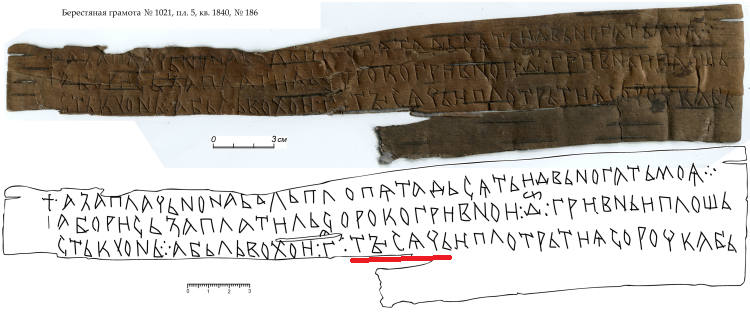 А заплачено за беличьи шкурки моих сорок пять [гривен] и две ногаты.А Борис заплатил сорок четыре гривны и пять с половиной кун. А всего беличьих шкурок три тысячи и два с половиной сорочка без …