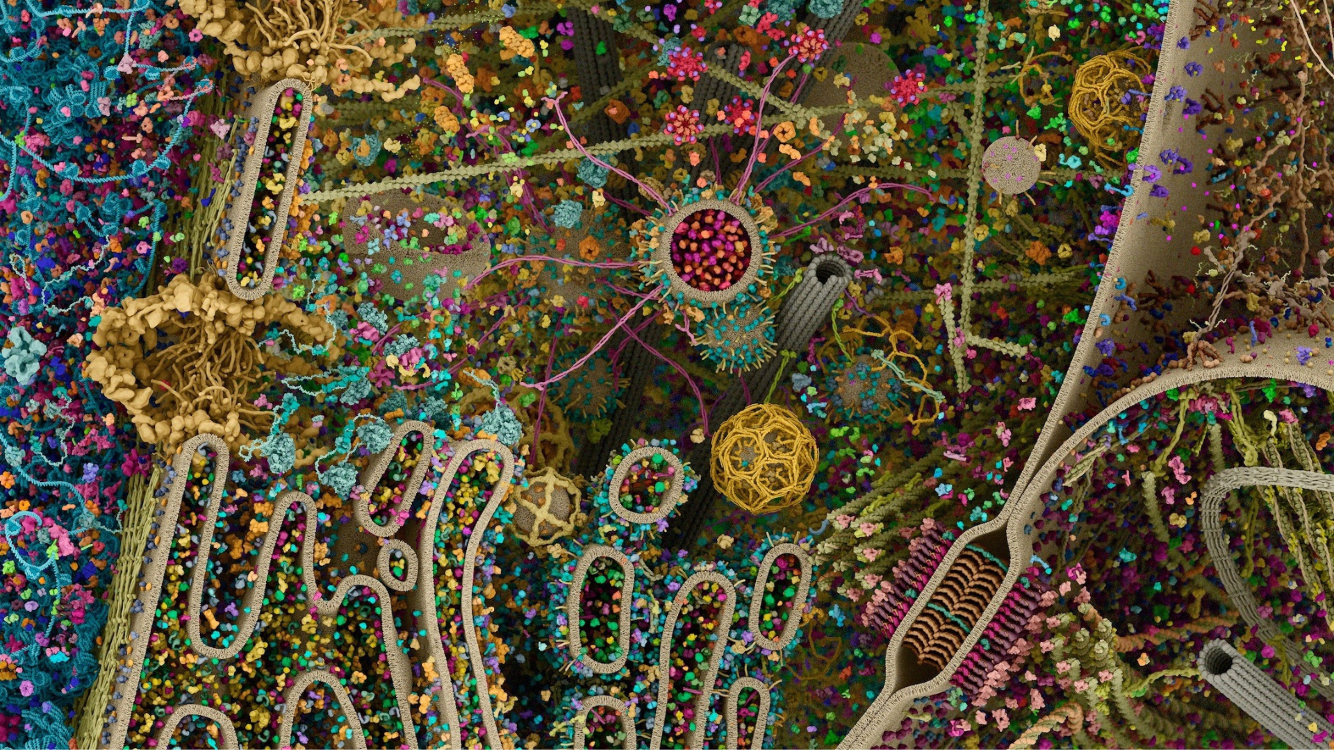 Если сильно упростить и визуализировать, то клетка внутри выглядит примерно так. Огромное количество различных молекулярных машин выполняющих свою функцию под контролем генетического аппарата (ДНК).