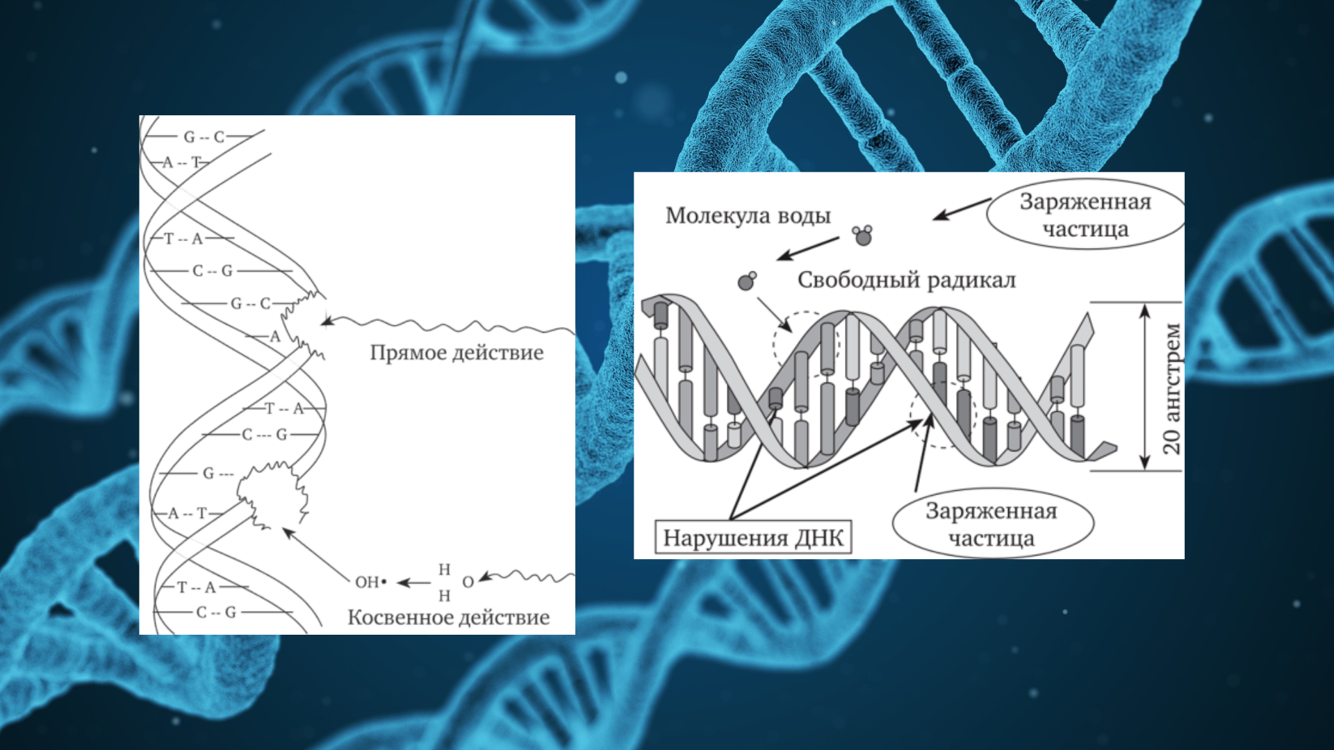 Из всех клеточных структур наибольшее значение для жизни имеют нуклеиновые кислоты (ДНК и РНК). Это закрученные молекулы, которые хранят информацию о том, как собирать и обслуживать все молекулярные машины, которые находятся в клетке. Ионизирующее излучение может “выбить” несколько молекул из последовательности, из-за чего генетический код организма будет нарушен.