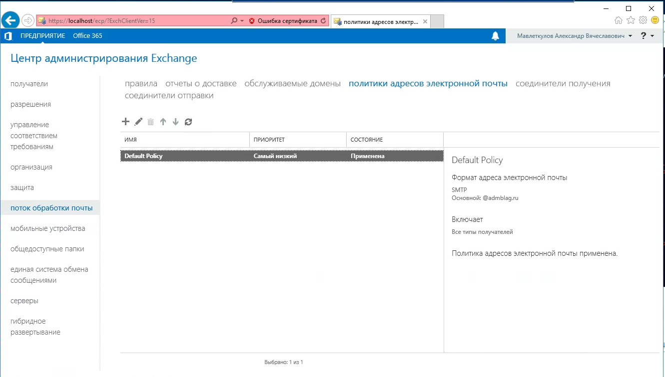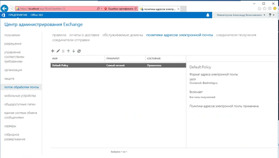 В разделе “Mail Flow” выбираем подраздел “Email Address Policies” и удаляем ненужный алиас