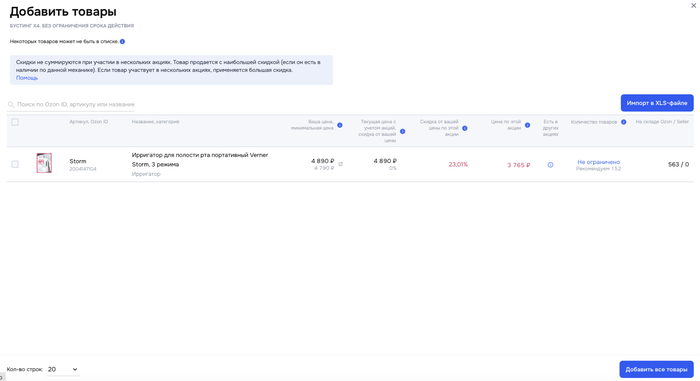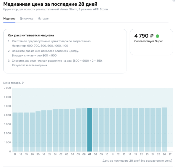Сейчас Ozon показывает, что медианная цена нашего товара составляет 4790 ₽. Тем не менее, нам по-прежнему предлагается участвовать в акциях по цене значительно ниже этой суммы.