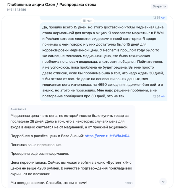 Лишь 16 мая, после разговора с менеджером, цена была вручную пересчитана. Мы вернулись в акцию по новой цене, которая нас устраивала.