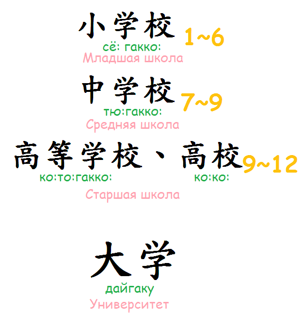 В Японии есть три вида школ – младшие школы, средние школы и старшие школы. В младших школах учатся шесть лет, начиная с семи, в в средних и старших по три года. Таким образом, полный школьный курс составляет 12 лет, а не 11 как в России. Более того, если в России ученики с первого по последний класс учатся в одном здании, то в Японии младшая, средняя и старшая школа это разные учреждения, хотя иногда средняя и старшая объединяются.