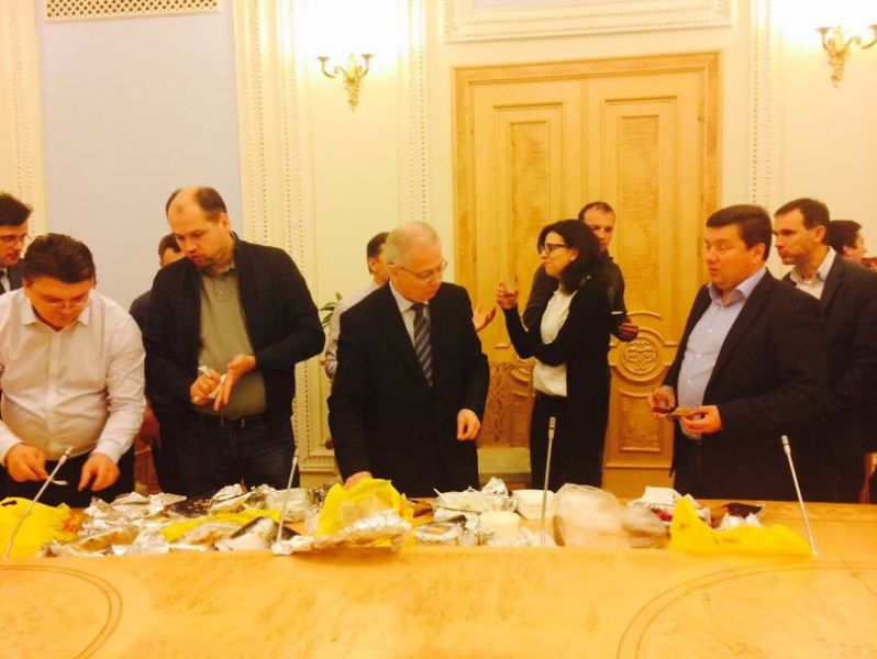Официальные лица жрут из общей посуды, стоящей на пакетах из магазина, за переговорным столом.