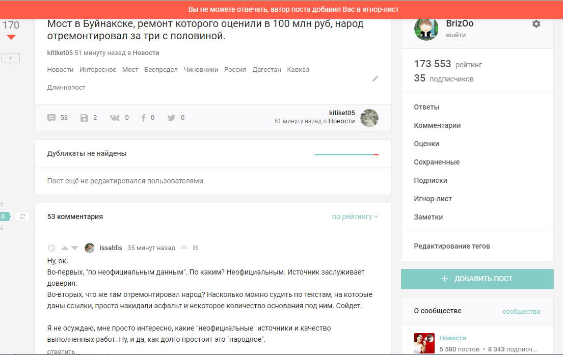 В нём есть странная информация, которая подверглась критике. Ответом стало "Вы не можете отвечать, автор поста добавил Вас в игнор-лист."