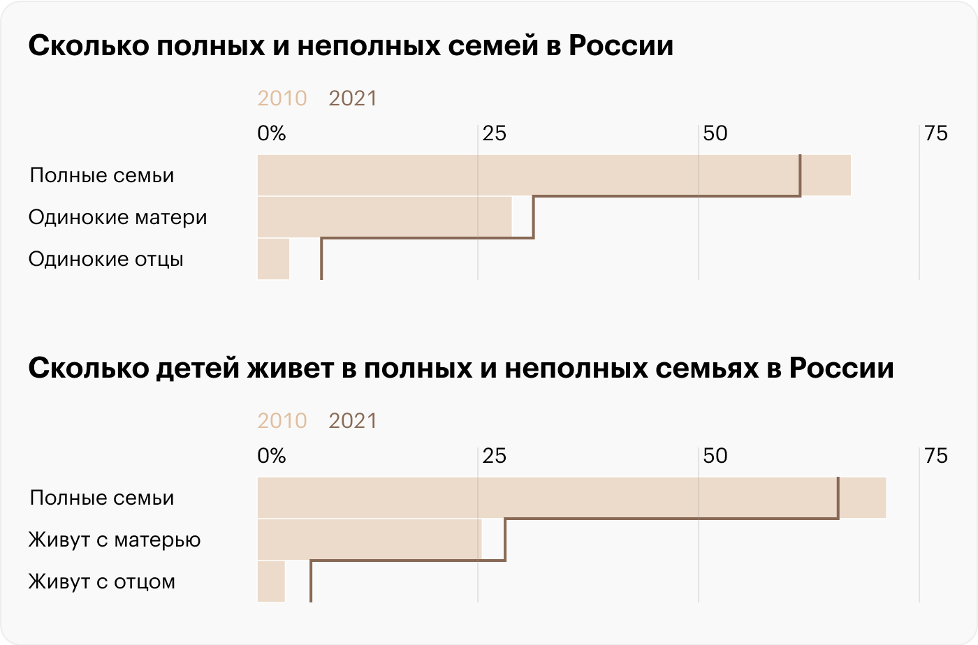 В последние годы доля домохозяйств с одним родителем растет: так, с 2002 по 2021 год доля «материнских» семей увеличилась в 1,6 раза, а семей с одинокими отцами — почти в четыре раза, указано в статье.