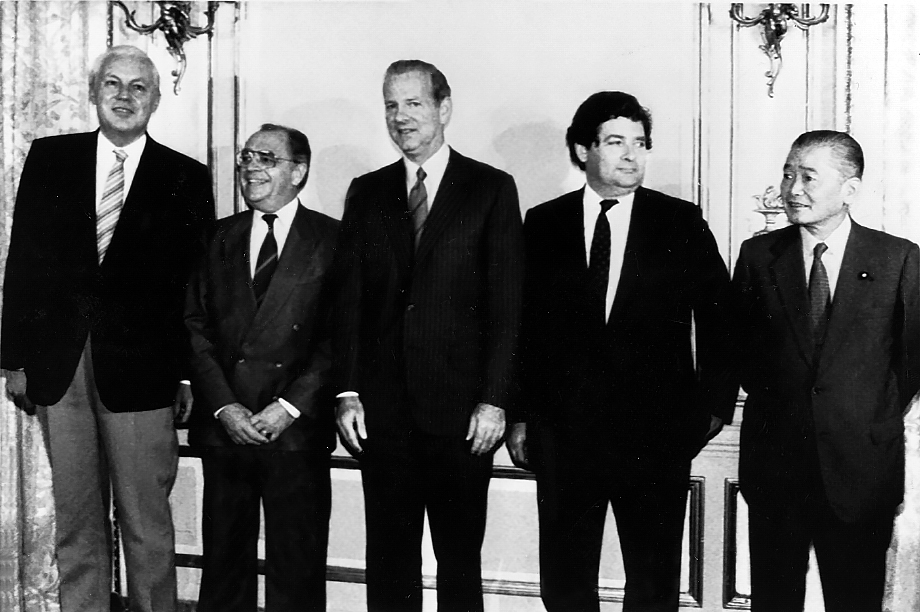 22 сентября 1985 года. Слева направо: Герхард Столтенберг (ФРГ), Пьер Береговой (Франция), Джеймс А. Бейкер III (США), Найджел Лоусон (Великобритания) и Нобору Такэсита (Япония).