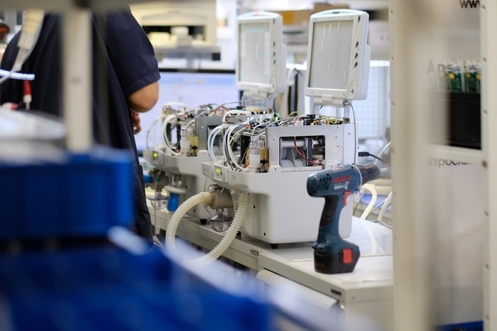 — Каждый прибор состоит из электронных компонентов и печатных плат. Здесь мы их производим. Сейчас идет монтаж печатных плат. Сначала автоматическая монтажная машина сама расставляет электронные компоненты на плате. Затем подключаются люди и вручную допаивают необходимые элементы. Потом плата поступает в печь, где компоненты закрепляются. В готовые платы загружается и настраивается «софт», затем они поступают в сборочный цех — вставляются в корпуса приборов — монитор пациента, аппарат искусственной вентиляции легких и так далее, — рассказывают на производстве.
