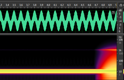 5. 500 Гц * 510 Гц. Умножение волн дают новые частоты. Видно 10 Гц на спектре.