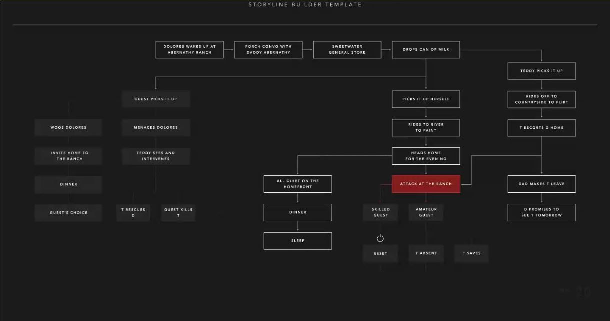 Так как «Мир Дикого Запада» — игра с открытым миром, игроки вольны исследовать его, как захотят. Нарративные дизайнеры игры предусмотрели множество возможных поворотов сюжета для Долорес: например, игрок может инициировать квест, подобрав с земли жестяную банку, а может присоединиться к бандитам и оказаться на ранчо Долорес под вечер. Но что будет, если он отправится гулять по полям и найдет ранчо в тот момент, когда Долорес еще не вернулась из города? Его ожидает скучный игровой опыт: никаких перестрелок, никакой пышнотелой Долорес.