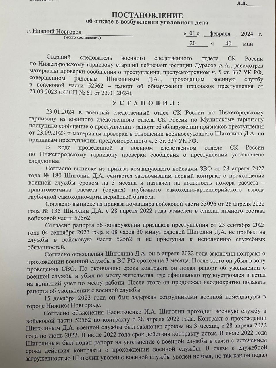 Объясняю в крадце. Был на СВО в 22 году в июле этого года разорвали контракт, так как нам не платили. В мае 23 года узнаю что ещё с какого то перепугу числясь в армии в части Мулино в/ч 52562. Год бегаю по прокурорам и в эту часть. И вот наконец-то СК РФ по Нижегородской области прислало постановление, что меня случайно объявили в розыск.