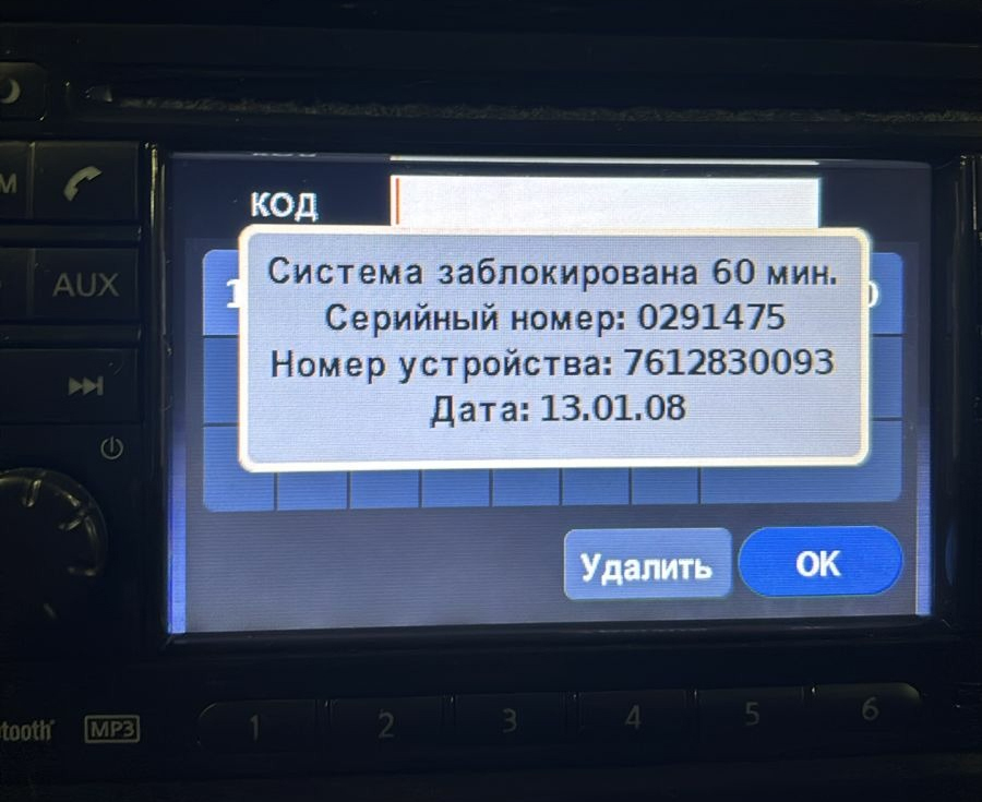 Для восстановления кода на такую магнитолу необходим серийный номер, номер устройства и дата производства. Все эти данные можно вывести на экране, нужно всего лишь ввести 3 раза произвольный код, после этого будет временная блокировка на 60 минут и на экране появятся данные.
