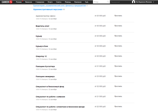 Яркий пример: 11 (!!!) вакансий на административный персонал, да и общее количество вакансий на одну фирму зашкаливает. Уже подозрительно. Смотрим, что за вакансии и когда были созданы.