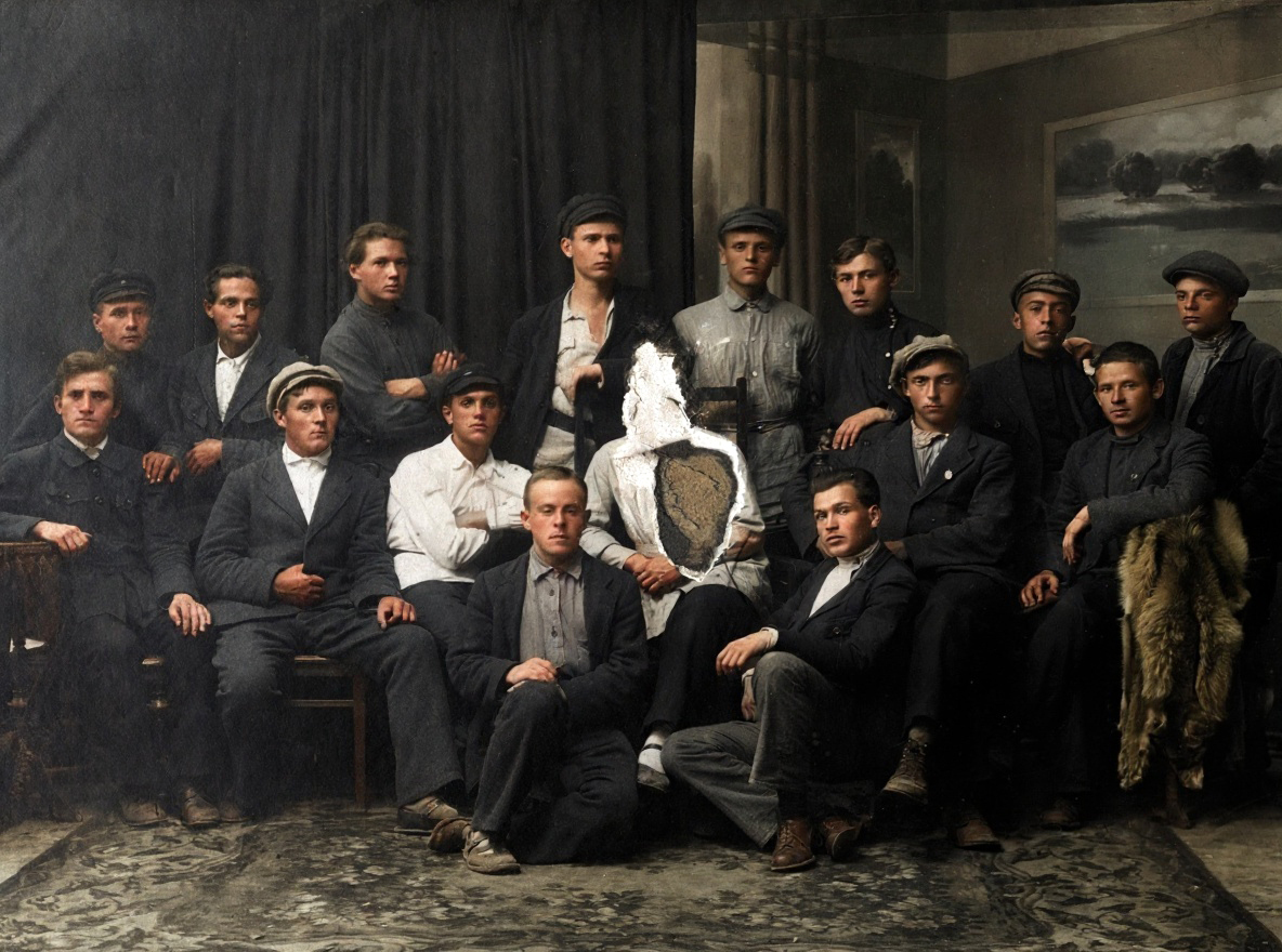 ГА ТО. Ф. Р-3097 Ф Оп. 1 Д. 671. Актив Тульской губернской организации РКСМ (групповой портрет). Цифровая реставрация и колоризация фотографии выполнены с помощью ИИ.