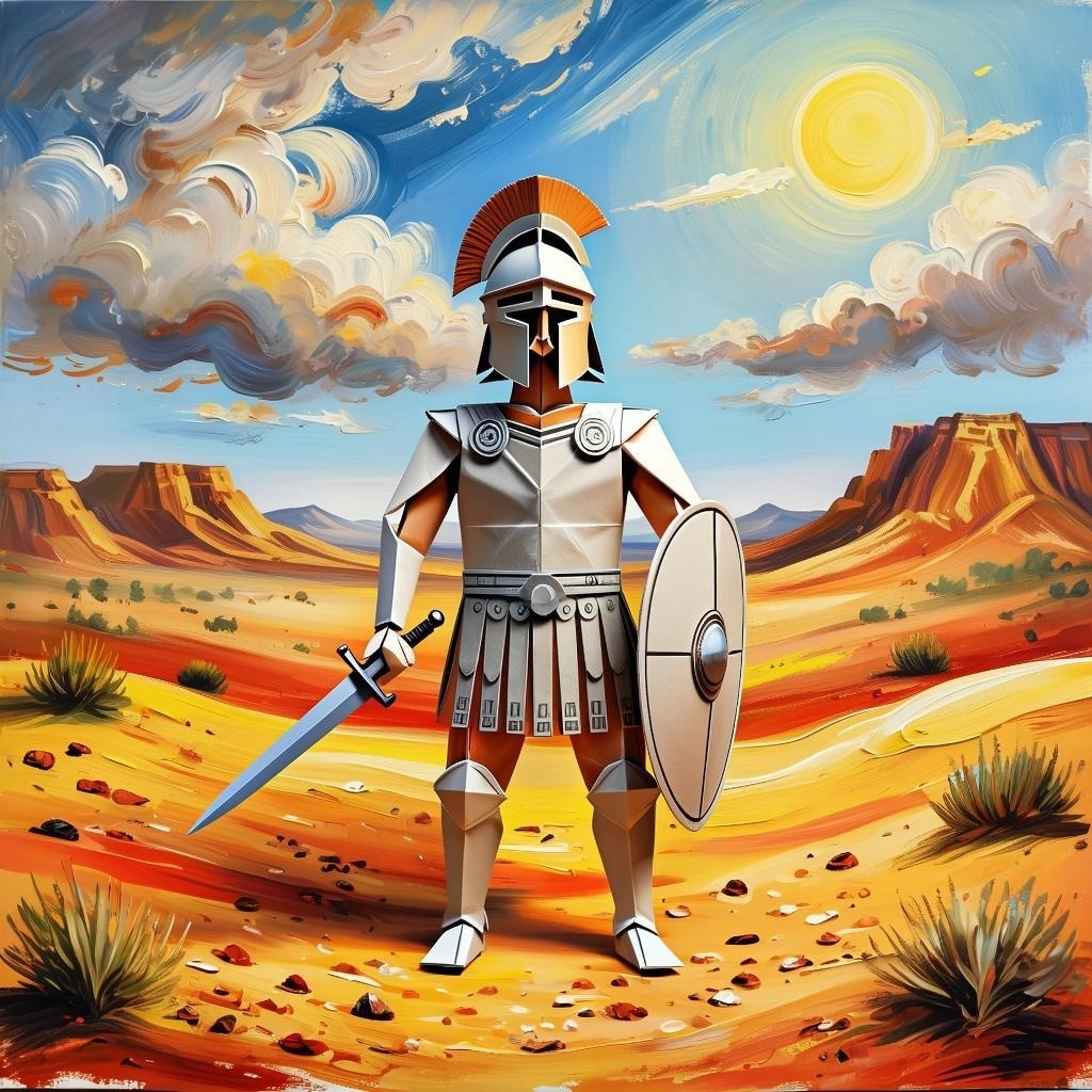 Древнеримский легионер в полной броне, но выполненный как фигурка из сложенного оригами. Сцена происходит в пустыне, которая нарисована масляными красками в стиле Ван Гога.