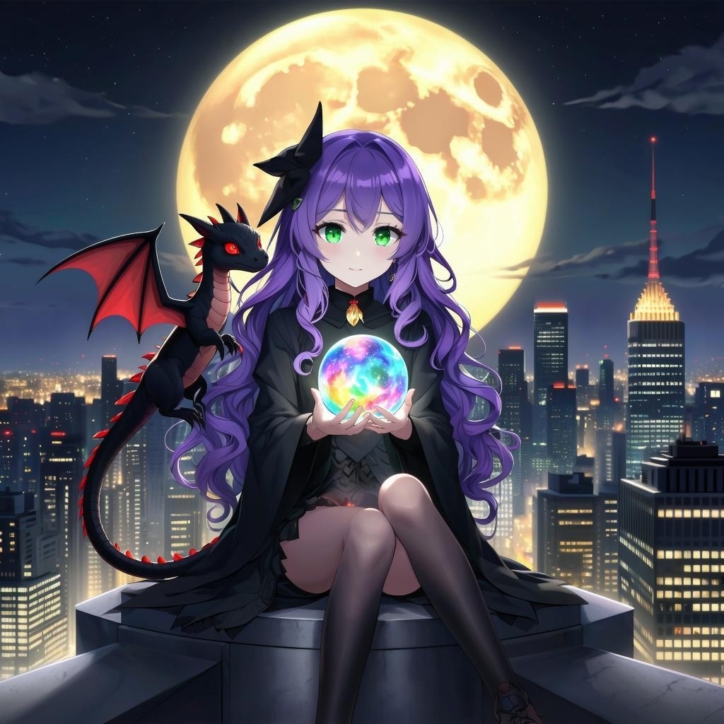 Девушка-ведьма с фиолетовыми волосами и зелёными глазами сидит на крыше ночного города под огромной желтой луной. Рядом с ней летает маленький черный дракон. Она держит в руках светящийся магический шар. Стиль аниме, детализированные глаза, яркие цвета, высокая детализация, 4K.