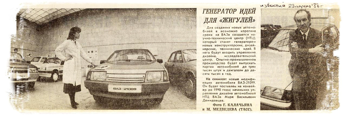 Апрель 1988 года. Маски сброшены: ВАЗ-2110 превратился в ВАЗ-21099. Автомобиль демонстрирует художник-конструктор Татьяна Матвеева, о чём корреспондент «Известий» забыл написать. Ну, а Марка Васильевича Демидовцева вы уже знаете.