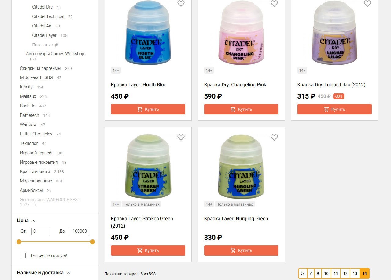 Если вам станет особенно скучно и захочется вернуться в 2012 год, то советую зайти в раздел Краски Citadel Colour, выбрать доступные к покупке и упорядочить по новизне и там в глубине веков вы найдёте краски, которые были выпущены в 2012 году. Среди них есть Layer: Nurgling Green - за 330 рублей. Она есть в наличии в Долгопрудном. В среднем есть мнение, что краски Цитадели в закрытом состоянии могут храниться до десяти лет. Этой краске уже 14 лет и она уже получила паспорт и скоро станет совершеннолетней.
