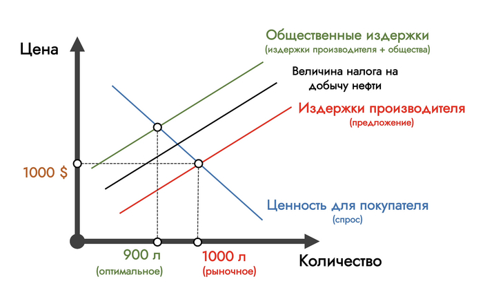 Как же заставить экономических агентов учитывать общественные издержки? Можно вообще закрыть все заводы и запретить производственную деятельность, которая сопряжена с отрицательными внешними эффектами. Но готовы ли мы отказаться от поездок на машинах в угоду экологии? Сильно сомневаюсь. Повторюсь, для экономистов задача заключается не в ликвидации внешних эффектов, а в максимизации общественной выгоды. В случае с нефтеперерабатывающим заводом хорошим способом снижения внешнего эффекта будет введение налога на добычу нефти, который увеличит издержки завода по добыче и переработке нефти и сдвинет кривую предложения вверх – ровно на величину введенного налога. Правильно рассчитанная величина налога сравняет частные издержки производителя с общественными издержками, и производители бензина будут выпускать оптимальное с точки зрения общества количество топлива.