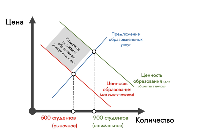 А что там с положительными эффектами? Так, повышение уровня образования положительно сказывается на производительности экономики и снижении уровня насильственной преступности, что является выигрышем для всего общества.