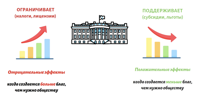 Как видите, отрицательные внешние эффекты подталкивают рынок к созданию большего количество благ, чем требуется обществу, а положительные экстерналии – к меньшему. Поэтому для достижения наибольшей общественной выгоды государство будет создавать ограничения для производства благ с отрицательными внешними эффектами (с помощью налогов), и стимулировать рынок, производящий блага с положительными экстерналиями (с помощью субсидий).