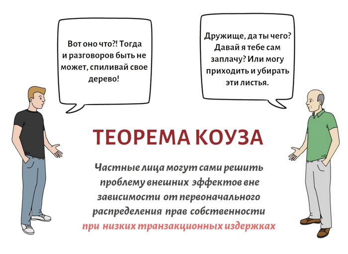 Интересно, что государственное вмешательство требуется не всегда. Порой люди сами могут решить проблемы внешних эффектов, просто договорившись между собой.
