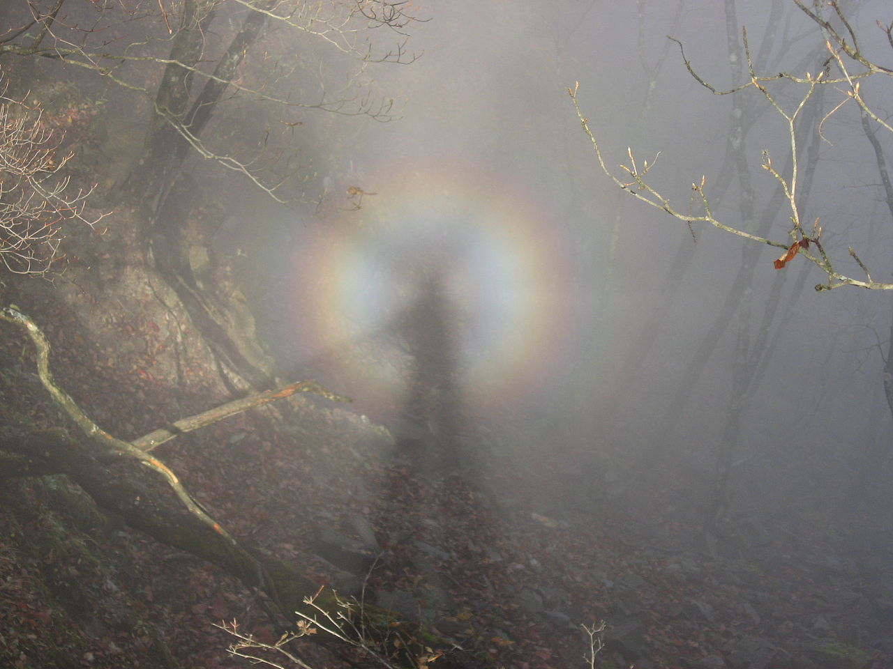 Замечательным и документально зафиксированным оптическим явлением считается, помимо прочего, так называемый брокенский призрак. Его еще называют горным призраком, который в действительности является не чем иным, как тенью наблюдателя на поверхности облаков (тумана) в направлении, противоположном солнцу. Тень может казаться наблюдателю очень большой и иногда окруженной цветными кольцами, она также способна «шевелиться» (порой совершенно неожиданно) из-за движения облачного слоя и колебания плотности в облаке. Брокенского призрака можно увидеть в горах во время тумана или облачности, или даже с борта самолета. Известность это явление приобрело благодаря пику Брокен, что в горах в Германии. Постоянные туманы и доступность малых высот позволяют видеть его очень часто.
