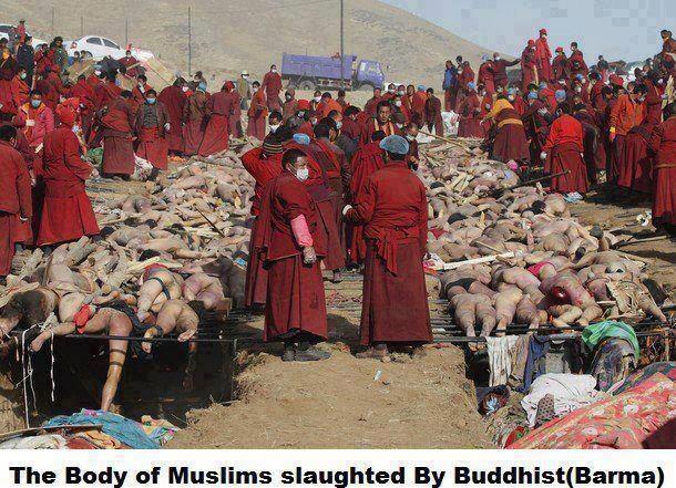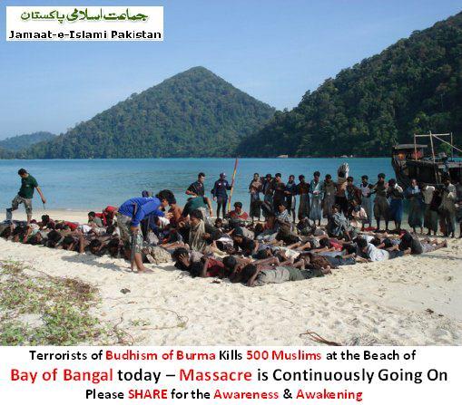 На этом снимке со ссылкой на Джамаат-и-Ислами в левом верхнем углу мы читаем: Буддийские террористы в Бирме убивают 500 мусульман.
