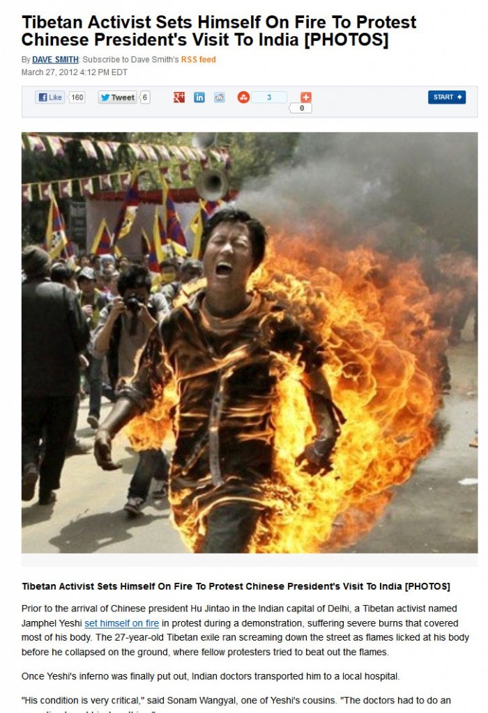 А на самом деле тибетских монах поджег себя в знак протеста в связи с прибытием экс-президента Китая Ху Цзинь Тао в Дели.