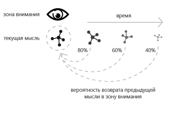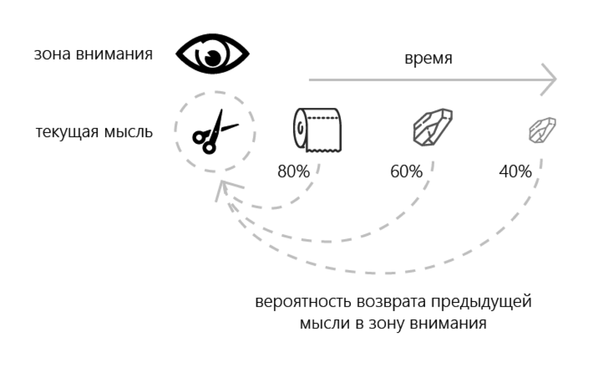 12. О какой мысли человек с большей вероятностью подумает повторно? О той, что промелькнула только что, или о той, что посетила голову час назад? Достоверно известно, что вероятность повторного «прокручивания» недавней мысли гораздо выше. Это наглядно отражено на схеме.