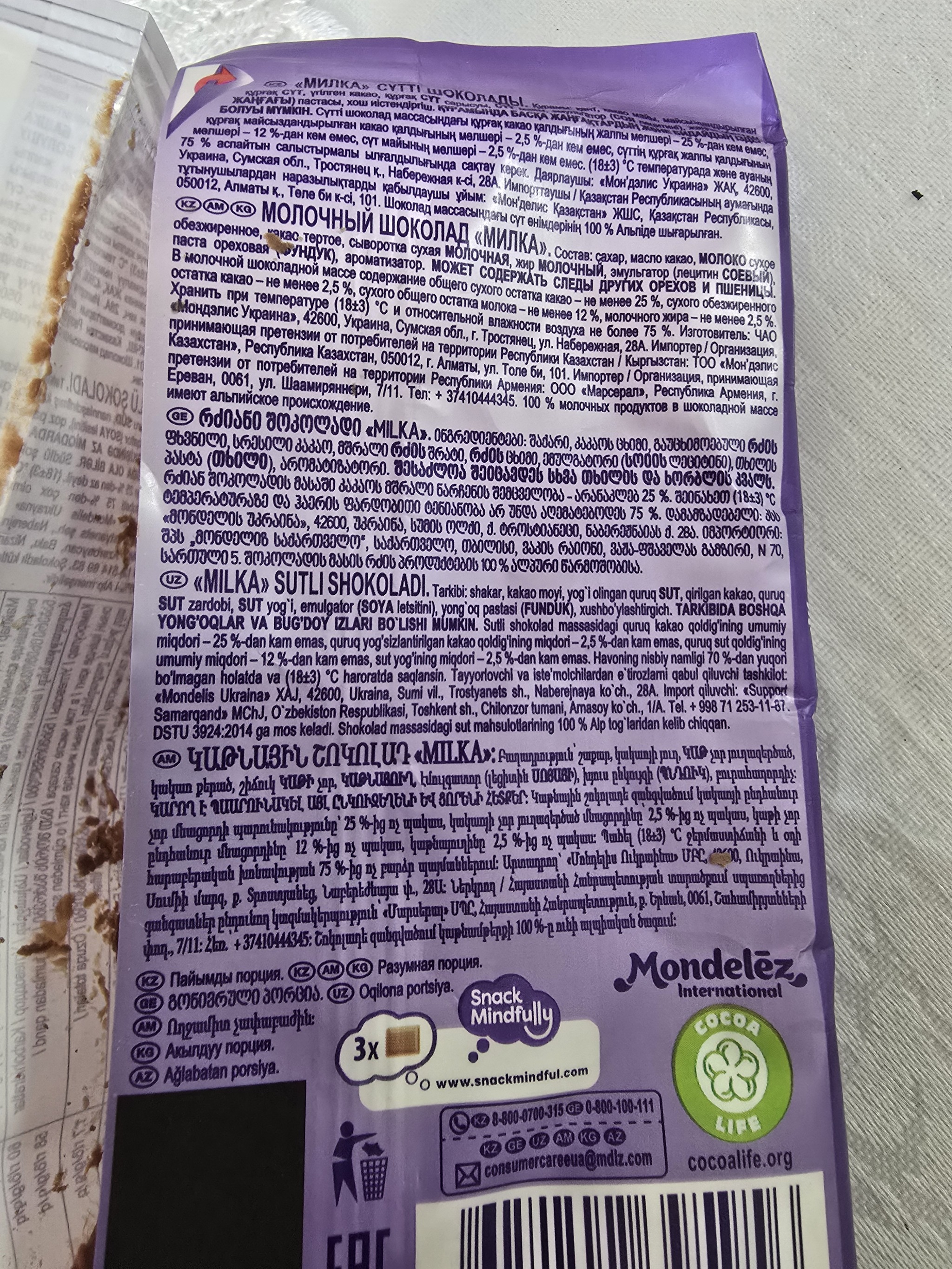 Вернулся на днях из Грузии. Отдохнул, всё отлично. И только сегодня обратил внимание на шоколадку "Милка", которую там купил. Выпущена на Украине, в Сумской области, и..... текст на русском на упаковке. Но это, оказывается, для Казахстана, Армении и Киргизии. Места пожалели на этикетке что ли? Какое-то неуважение к казахам, армянам, киргизам и их национальным языкам.