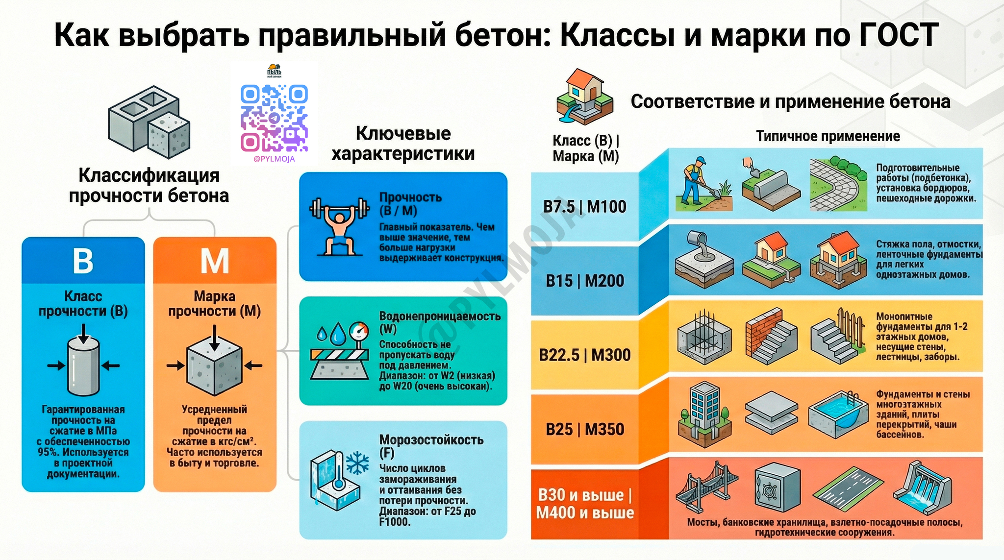 Представленная информация носит ознакомительный характер и помогает получить общее представление о классах и марках бетона. Для выбора состава и класса бетона в каждом конкретном случае необходимо выполнять инженерный расчёт, учитывая: