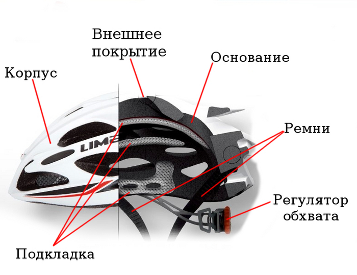 Конструкция у всех моделей велошлемов практически одинаковая и состоит из следующих деталей и элементов: