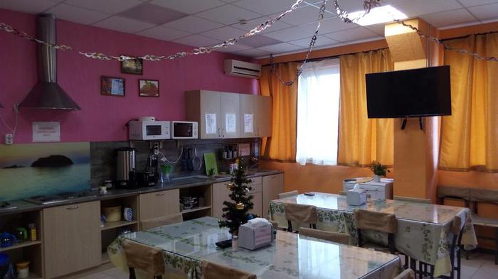 Как, опять же, показывает практика, постояльцы предпочитают сидеть за отдельным столом, если у них есть такая возможность, а потому на кухне не маленький столик за которым сидит 20 человек, а крупные столы (мест на шесть) с запасными стульями и возможностью выбора: сесть-ли подальше или поближе от конкретного индивида.